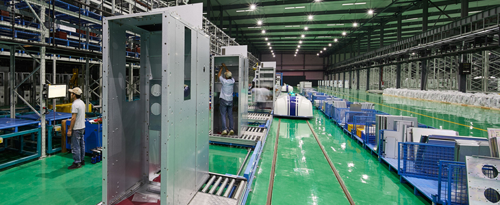 数字化工厂占地面积185亩,建筑面积5.8万平方米,共分两个生产车间,中压成套生产车间和低压成套生产车间,主要设备和系统包括:配电设备柔性装配线、钣金柔性自动化生产线、库线一体化铜母线自动加工线、二次线束自动加工线,以及智能物流与仓储系统、能源管理系统、综合监控系统、数字化检测系统等,具备年产5万面中低压智能配电设备的能力,并实现公司产品在城市轨道交通等供电系统中的全寿命周期管理,成为联通上游供应商和客户的数字化运营平台。