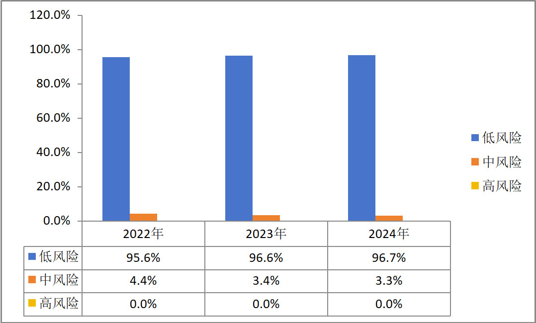 2024年,我公司高风险供应商0,中风险供应商占比为3.3%,低风险供应商占比为96.7%,中/高风险供应商审核率为100%。根据近三年供应商风险评估数据显示,我公司低风险等级供应商数量占比呈现持续优化态势,供应链风险管理水平显著提升。